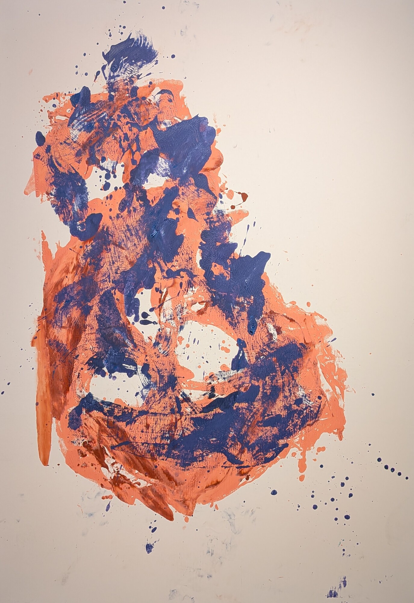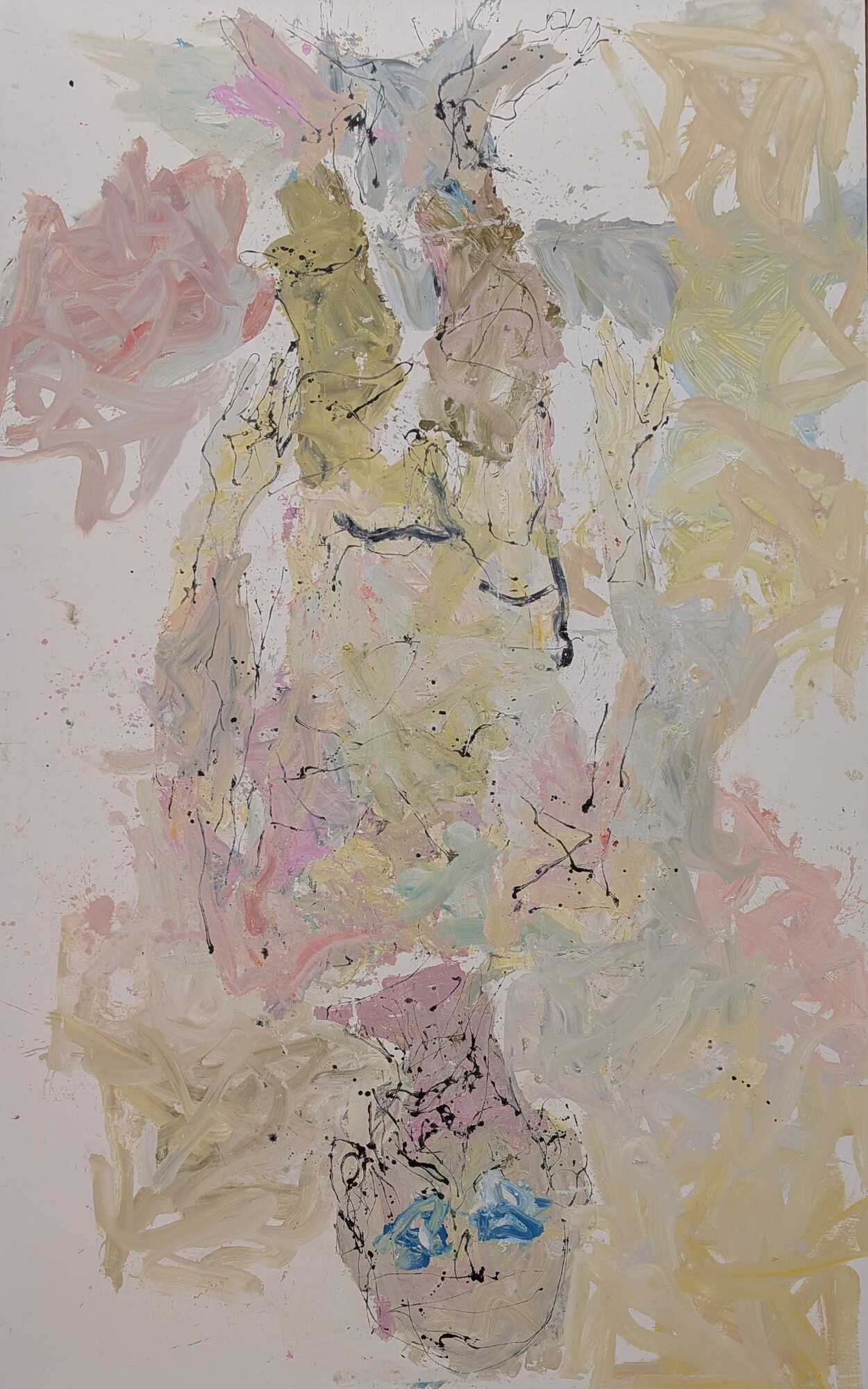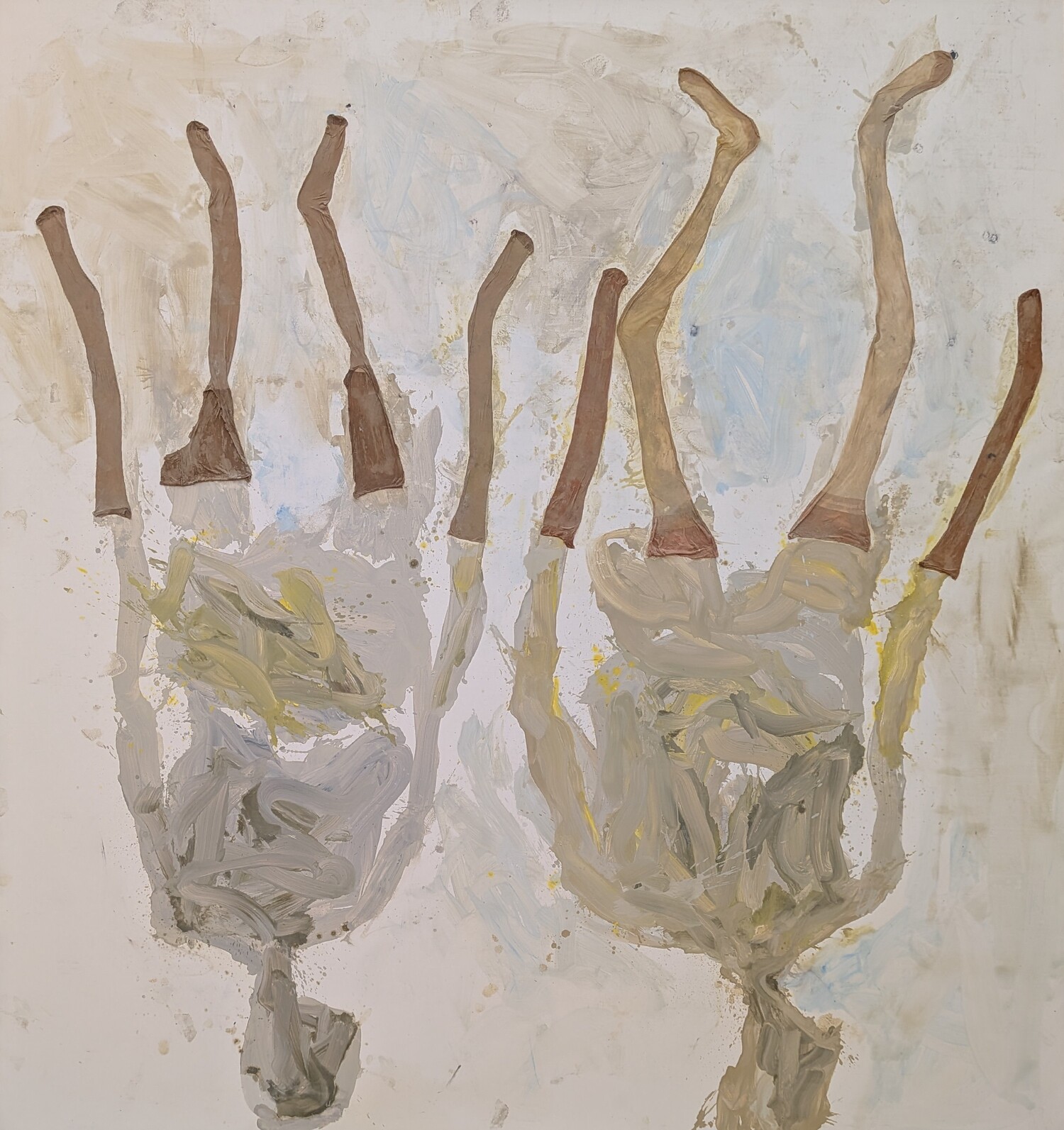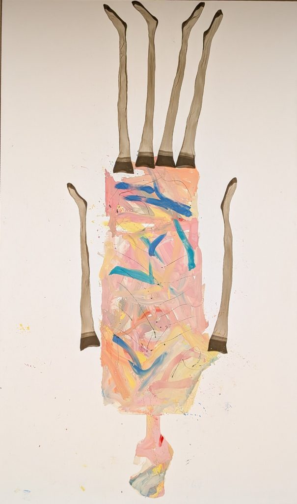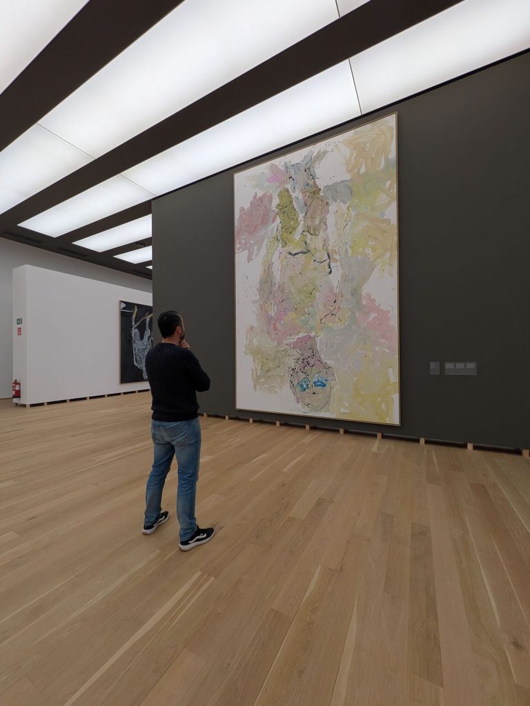 A primera vista parece que no hay gran dificultad en dibujar una figura deformada o unas piernas mal proporcionadas, y probablemente cualquiera podría intentarlo. El problema no está ahí. El problema viene cuando tienes que dibujar sobre un lienzo enorme, donde los errores se aprecian con mayor facilidad. Además, el uso del color, que puede parecer sucio, descuidado o random (como les gusta decir a mis hijas), está mucho más pensado de lo que parece. Trabajar con pocos colores, apagados y sin buscar que sean bonitos, tiene su truco. A mí de da la sensación de que todo esto se realiza a base de ensayo, error y decisiones constantes sobre cuándo seguir y cuándo parar. Esto no es Photoshop, no hay borrador posible, no hay vuelta atrás limpia. Todo queda ahí, conviviendo con lo que ya estaba, y eso exige mucha experiencia y mucho control, aunque el resultado no lo aparente. También, algo que me parece muy difícil es la capacidad de repetir este tipo de obras una y otra vez sin que se vuelva automático y parezca una copia de una copia. Si nos fijamos en la trayectoria de Baselitz, lleva décadas trabajando con las mismas figuras y gestos, y aun así parece que consigue seguir atrayendo al público. Mantener una carrera así con tan pocos recursos es, probablemente, lo que hace que algo que parece simple en realidad no lo sea en absoluto.