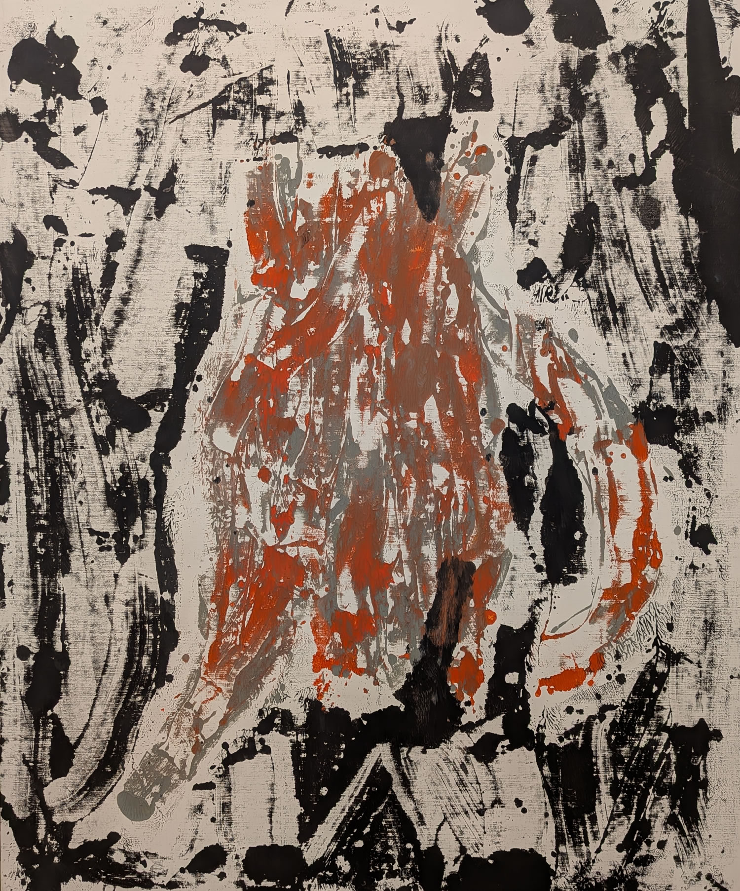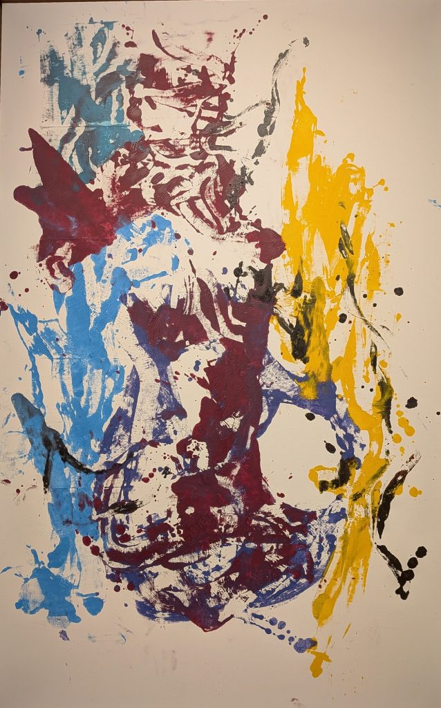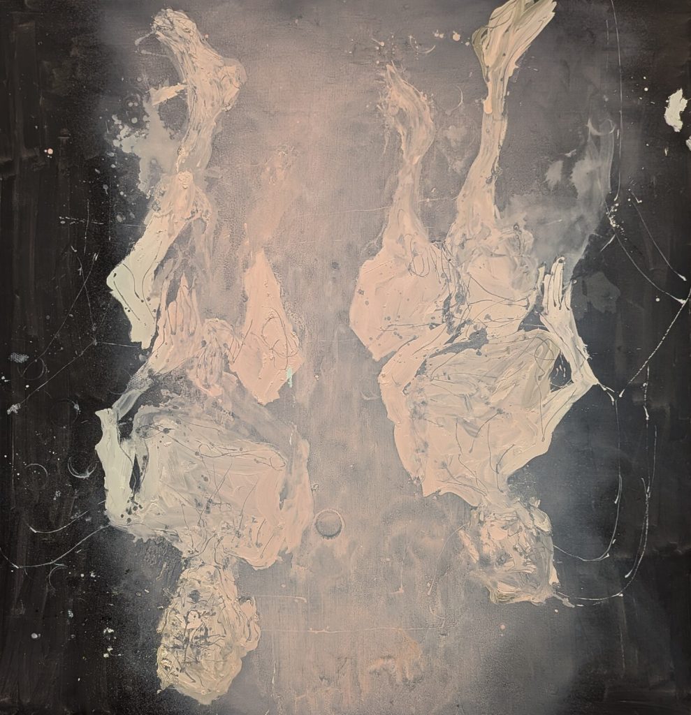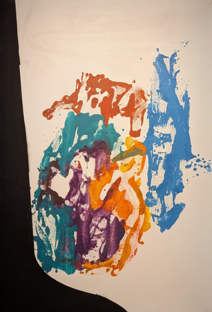 Accedí a la primera planta por las escaleras, accediendo a la sala por unas obras abstractas. A mi me encanta lo abstracto por lo que no pude empezar de mejor manera. Una de las obras que más me llamó la atención fue la que muestro en la parte inferior. No lo puedo explicar pero empecé a ver cosas por todos lados, perros, una medusa, la letra e (o el número), un ratón. El caso es que más tarde la usé como juego con mis hijas para ver que veían ellas y el resultado fue muy gracioso. Tan gracioso que unos días más tarde en otra visita a Bilbao las llevé a verlo en persona y nos partimos de risa otra vez.