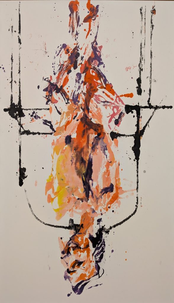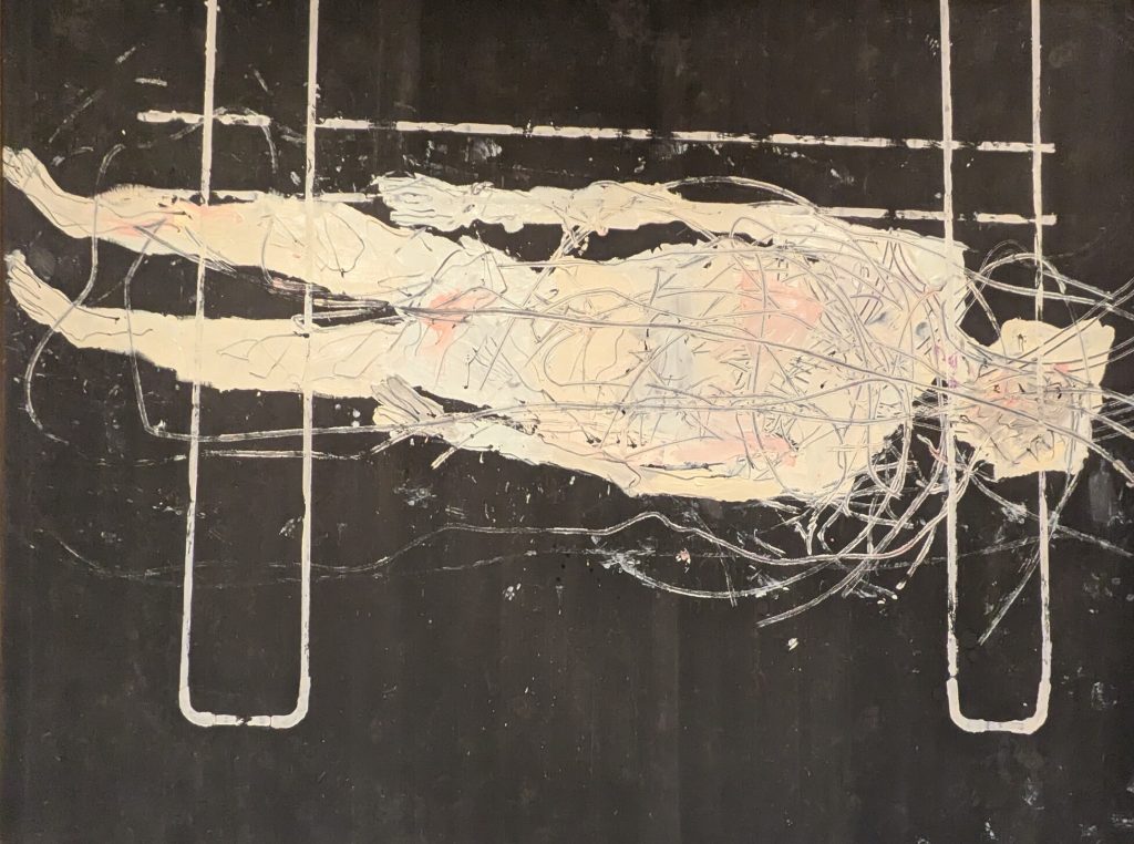 Tras esta obra, pasas por una habitación con poca luz donde la mayoría de las obras son abstractas y finaliza la exposición justo donde hemos empezado. Al bajar las escaleras me di cuenta que las personas que subían en ascensor accedían a la sala más hacia el centro y se topaban con dos obras, pudiendo empezar a ver la exposición en sentido horario o antihorario. En sentido antihorario es exactamente como lo hice yo, empezando por lo abstracto, obras invertidas y sala de baja iluminación. En sentido horario empezarías casi seguro por la sala poco iluminada y me surgió la duda de si empezar de una forma u otra condicionaría el resultado. Me estuve fijando y no encontré claramente una señalización de donde comienza la exposición ni en que orden, pero creo que esta exposición en concreto se disfruta más en sentido antihorario empezando por lo abstracto, continuando con la incomodidad que generan las obras invertidas y reposando finalmente en la sala oscura.